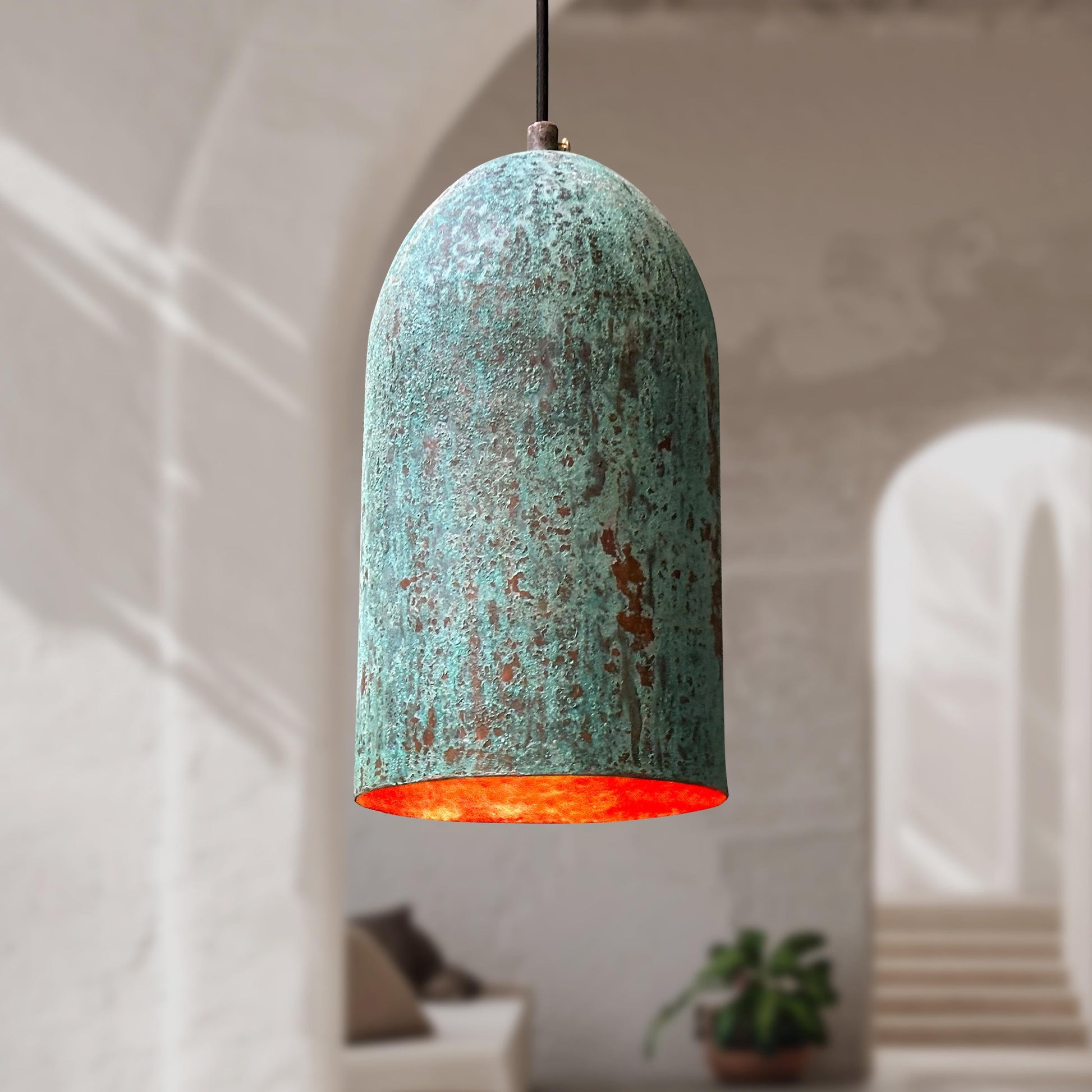 3 Handmade Oxidized Copper Pendant Lights – Green Patina Farmhouse Verdigris Ceiling Fixtures