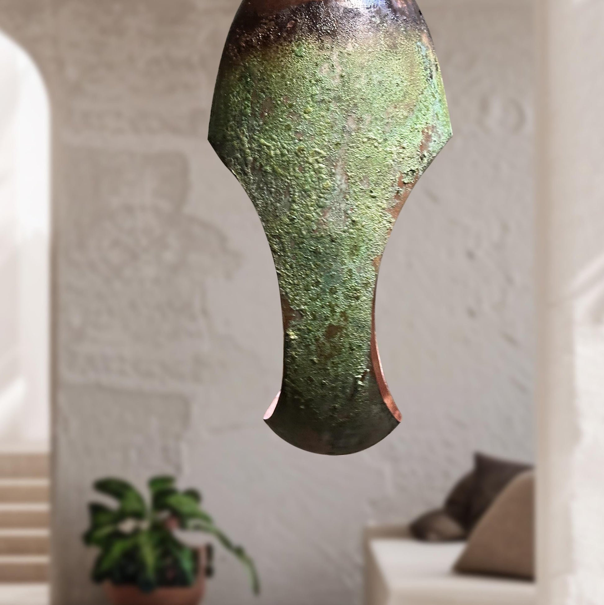Handcrafted Oval Cut Copper Pendant Light with Green Patina Finish.