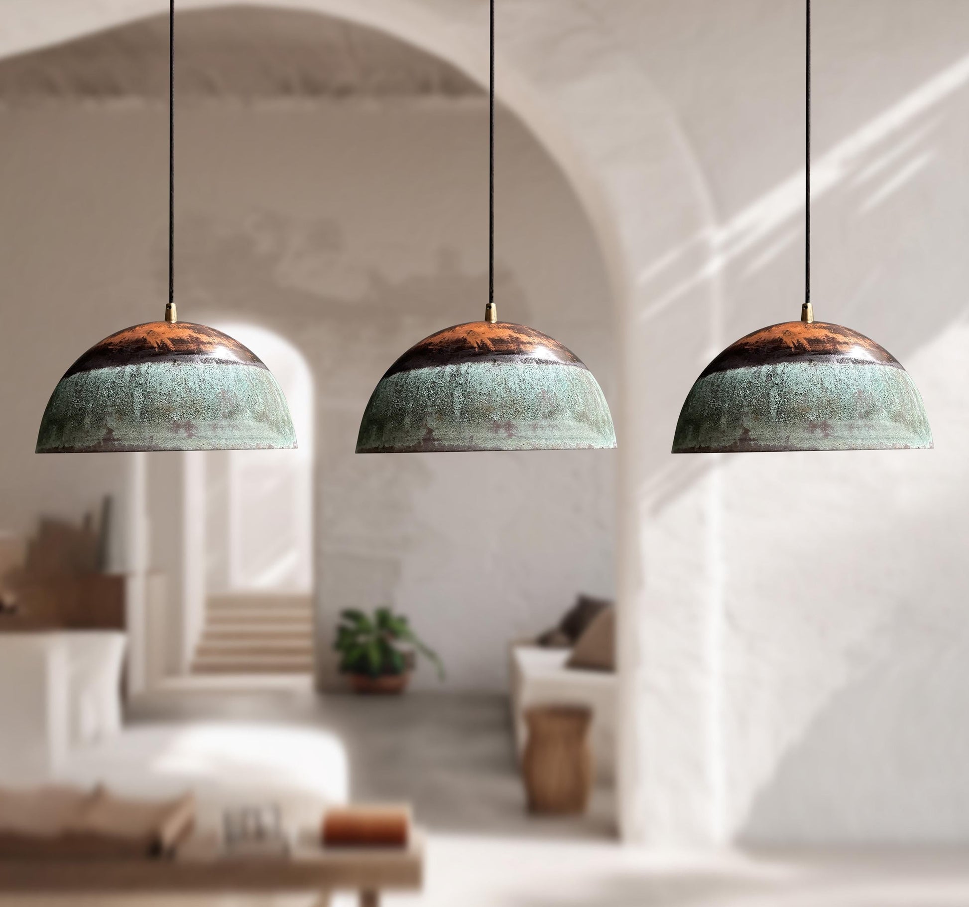 Set of 3 Green Patina Copper Pendant Lights – Oxidized Rustic Dome Kitchen Fixtures